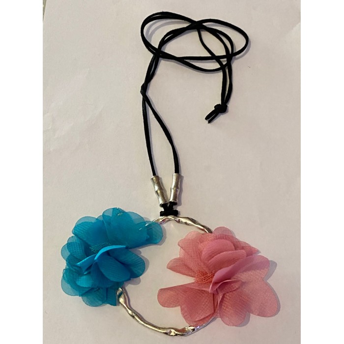 Colgante redondo con flores de tela y cordón negro.